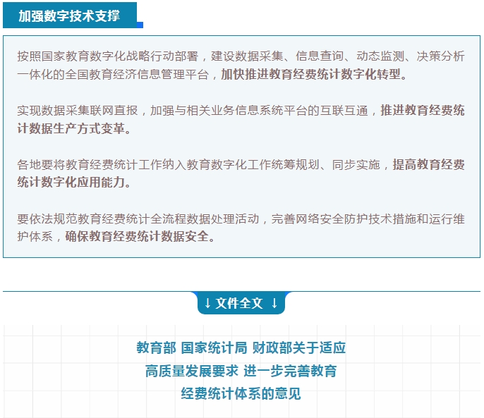 (十三)加强数字技术支撑。按照国家教育数字化战略行动部署,建设数据采集、信息查询、动态监测、决策分析一体化的全国教育经济信息管理平台,加快推进教育经费统计数字化转型。实现数据采集联网直报,加强与相关业务信息系统平台的互联互通,推进教育经费统计数据生产方式变革。各地要将教育经费统计工作纳入教育数字化工作统筹规划、同步实施,提高教育经费统计数字化应用能力。要依法规范教育经费统计全流程数据处理活动,完善网络安全防护技术措施和运行维护体系,确保教育经费统计数据安全。