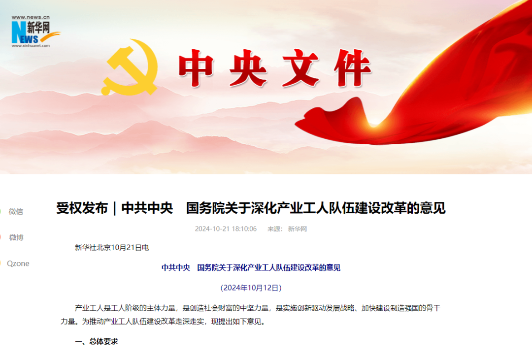 为推动产业工人队伍建设改革走深走实,中共中央、国务院发布《关于深化产业工人队伍建设改革的意见》。文件提出,积极利用数字技术为产业工人民主参与提供更为精准便捷的服务。促进产业工人知识更新和学历提升,发挥国家各类职业教育智慧教育平台作用,打造全国产业工人智能化技能学习平台。文件全文一起来看——