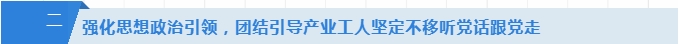 (一)持续强化产业工人队伍思想政治工作。坚持不懈用习近平新时代中国特色社会主义思想凝心铸魂,推动党的创新理论在产业工人中落地生根,结合实际做好网上思想政治引领,持续抓好主题宣传教育,开展普遍轮训。鼓励支持大国工匠、高技能人才参加国情研修,鼓励支持产业工人参加青年马克思主义者培养工程,深化社会主义核心价值观教育,筑牢团结奋斗的共同思想基础。